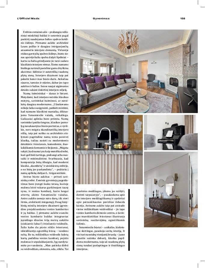 Ar žingsniuodami senamiesčio gatvėmis mėgstate pamintyti, koks interjeras gyvena už istoriniu paveldu tapusių pastatų sienų ir kokios atmosferos galima tikėtis užsukus į būstą, statytą XX a. viduryje? Architektė Laura Grigaravičiūtė supažindina su namais, įkurtais Vilniaus Senamiestyje. Klasikiniai, tačiau alsuojantys dabartimi, pritaikyti šiuolaikiniam skoniui, bet išsaugoję paslaptingos praeities pėdsakus. Tokia interjero nuotaika vadinama modernia klasika.
