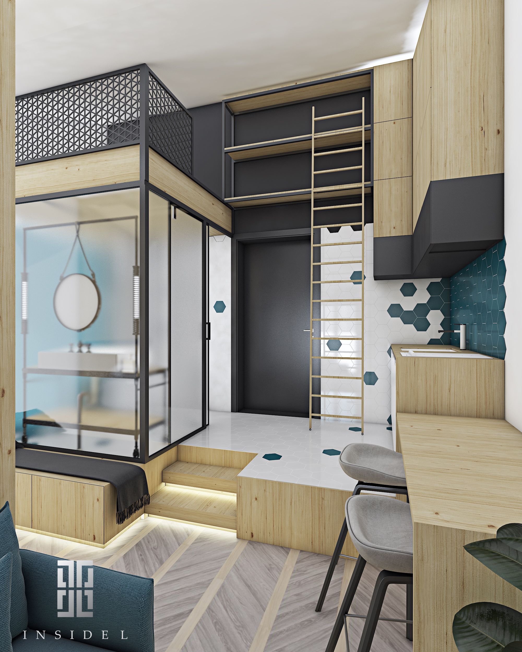 Planuojamas būstas yra 28 kv. metrų, jame viskas ko reiktų dviejų asmenų gyvenimui. Kukli erdve, kurioje patenkinami esminiai poreikiai. Matinio stiklo vonios kambarys, kuris leidžia mėgautis atvira erde. Norint privatumo, galima atsitverti išorėje užuolaida. Kaip tik virš sanmazgo numatyta vieta galėtų būti išnaudota darbui ar atskiram poilsiui. Erdvėje del inžinerinių srendimų suformuoti keli laipteliai, kurie dar palieka erdves po vonia pilno ištraukimo stalčiams. Šis principas taikomas ir po dvigule lova. Kompaktiškoje virtuvėje yra šaldiklis, kaitlente ir plautuve, todėl lengva vakariene gali buti paruošta ir šalimais patiekta ant pusbario stalviršio. Rubų spinta ir darbo erdvė formuojama ties langu iš abiejų pusių. Tv zona derinama su dekoratyviniu metalu, medžiu ir veidrodžiu, kas perteikia bendrą pastato stilistiką ir medžiagiškumus atvedančius iš bendrų erdvių į namus.